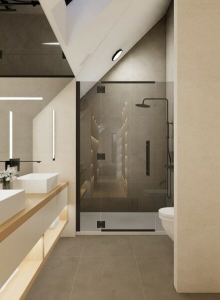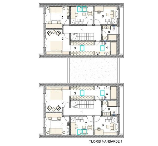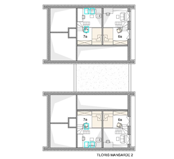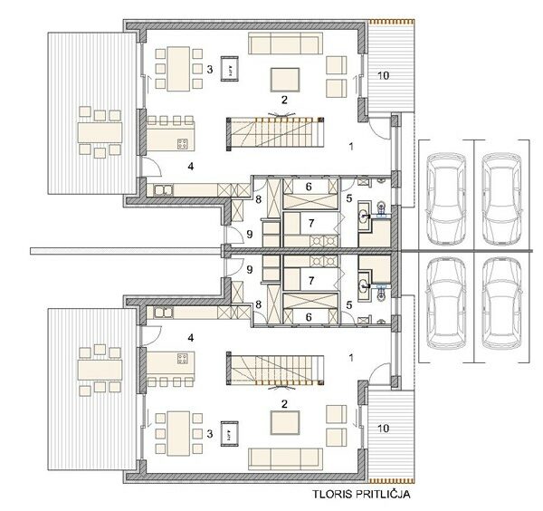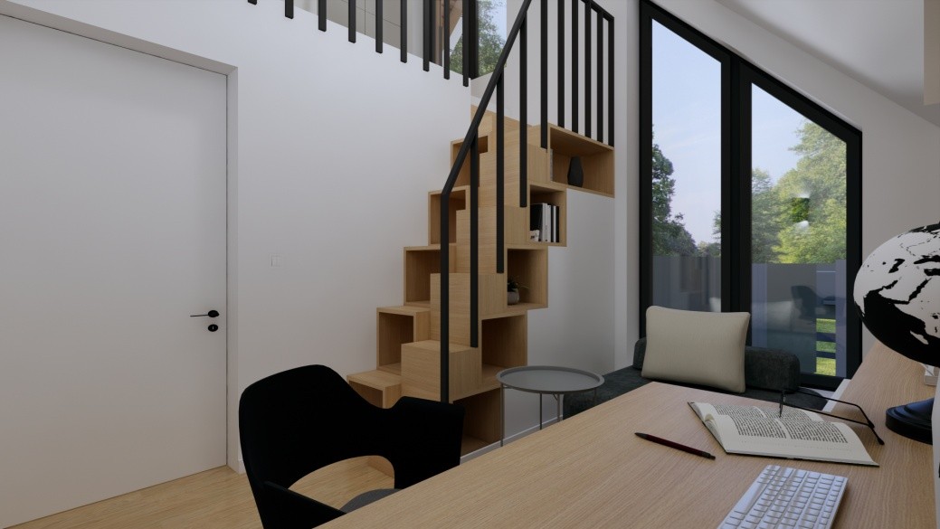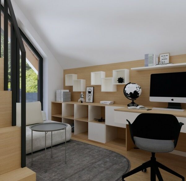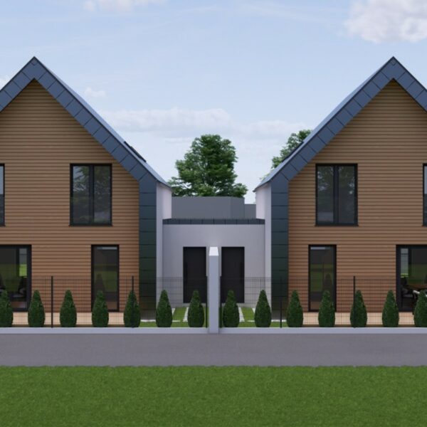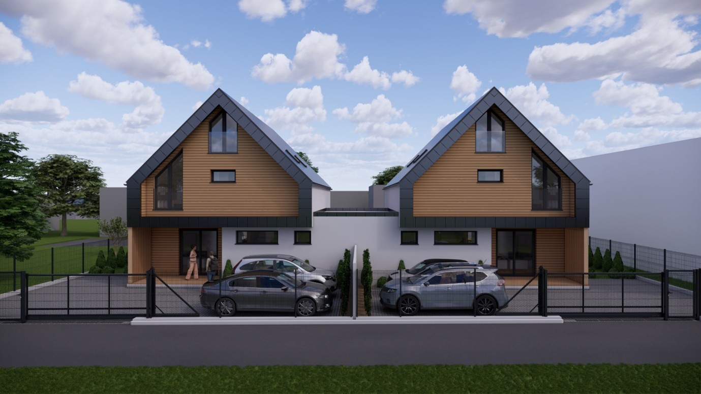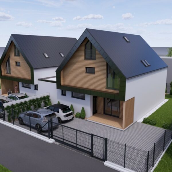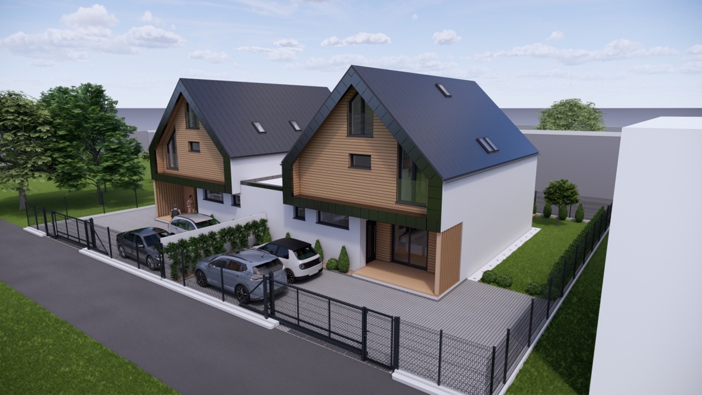 The semi-detached house consists of two equal, mirror-designed residential units, each with its own private entrance and private garden. The building is designed over two floors (ground floor + attic) with additional usable attic space above the children’s rooms.