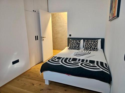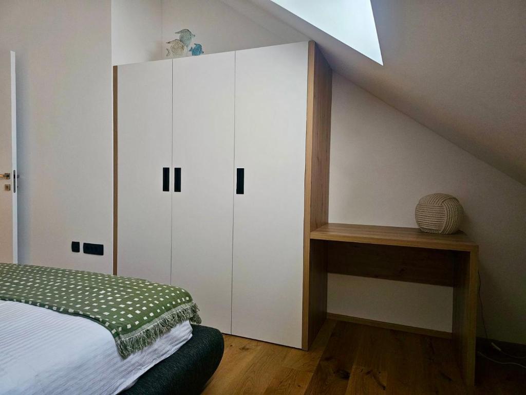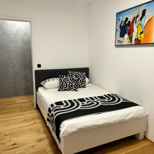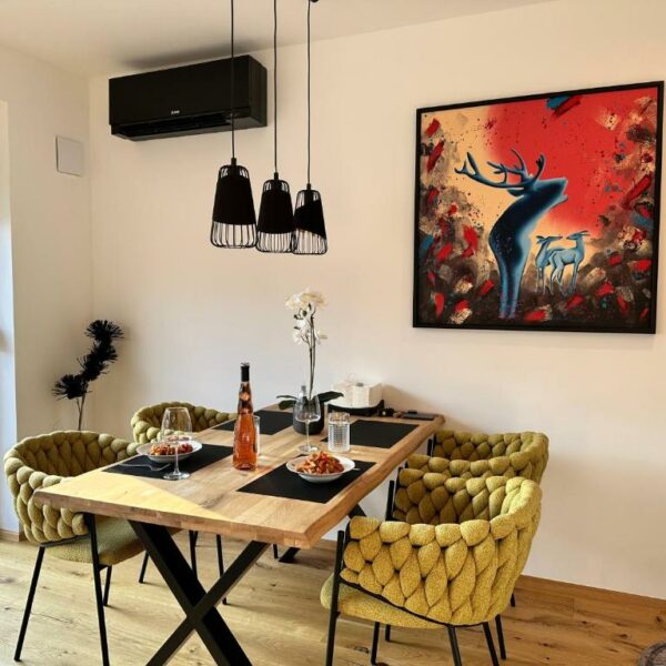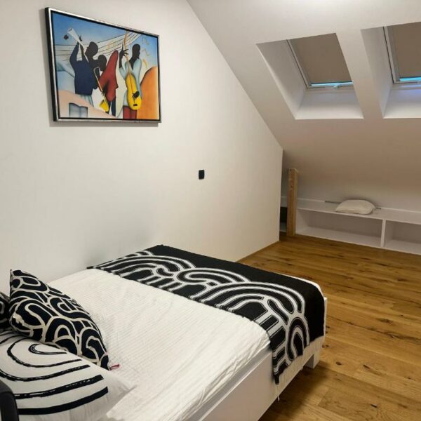 The apartment is bright and modernly designed, featuring an open-plan living area and a functional kitchen. Thanks to the duplex layout, spacious design, and sofa bed, it can accommodate up to 6 people.