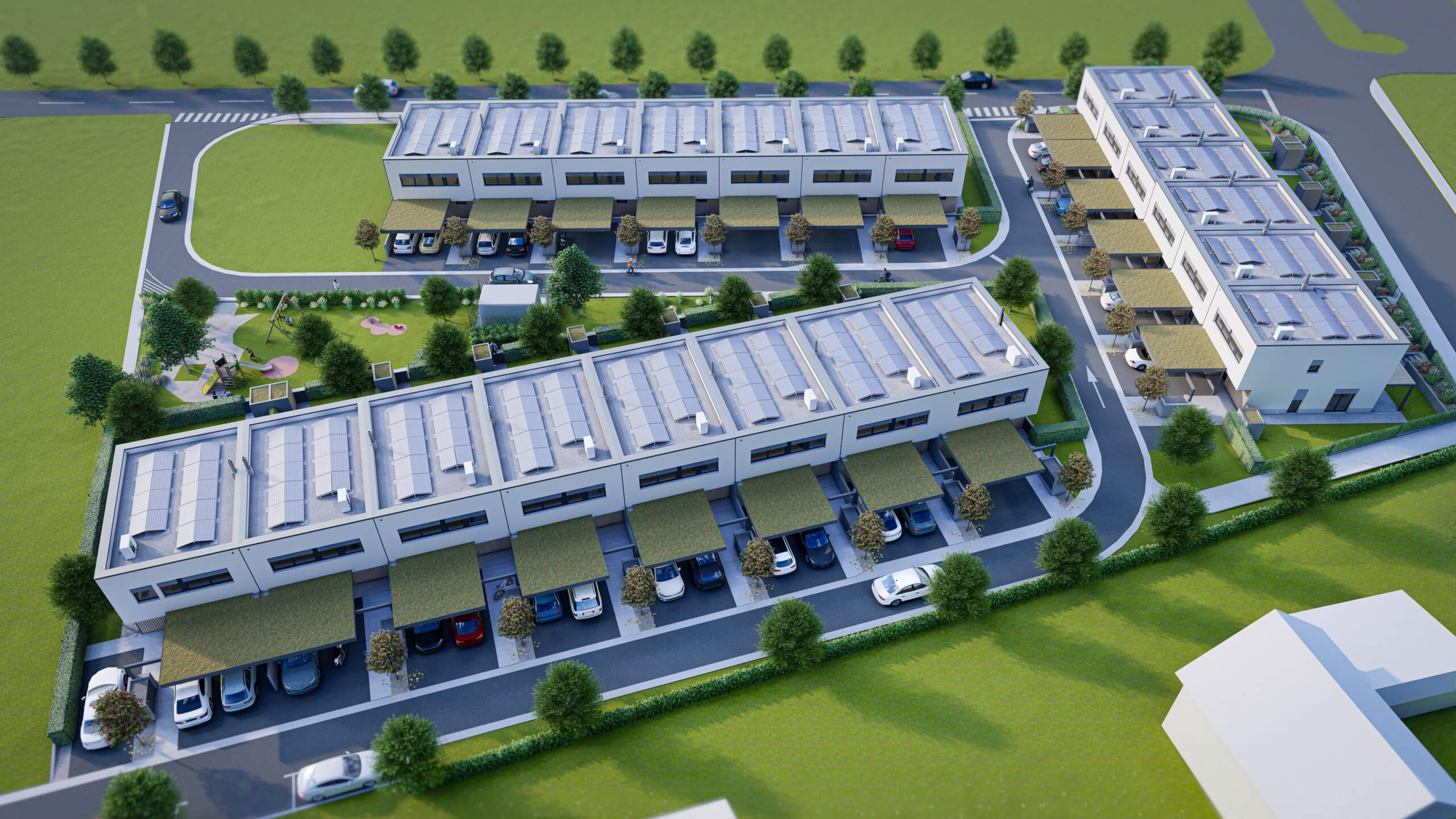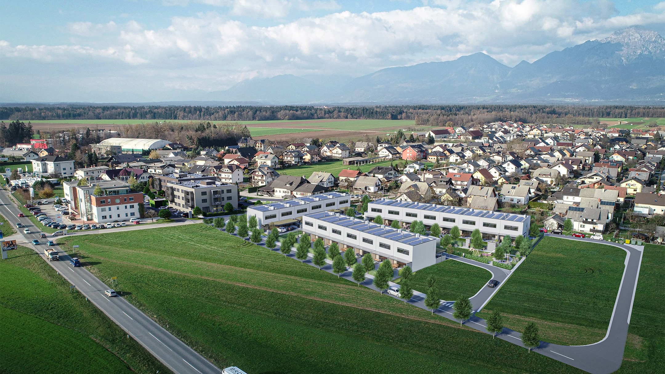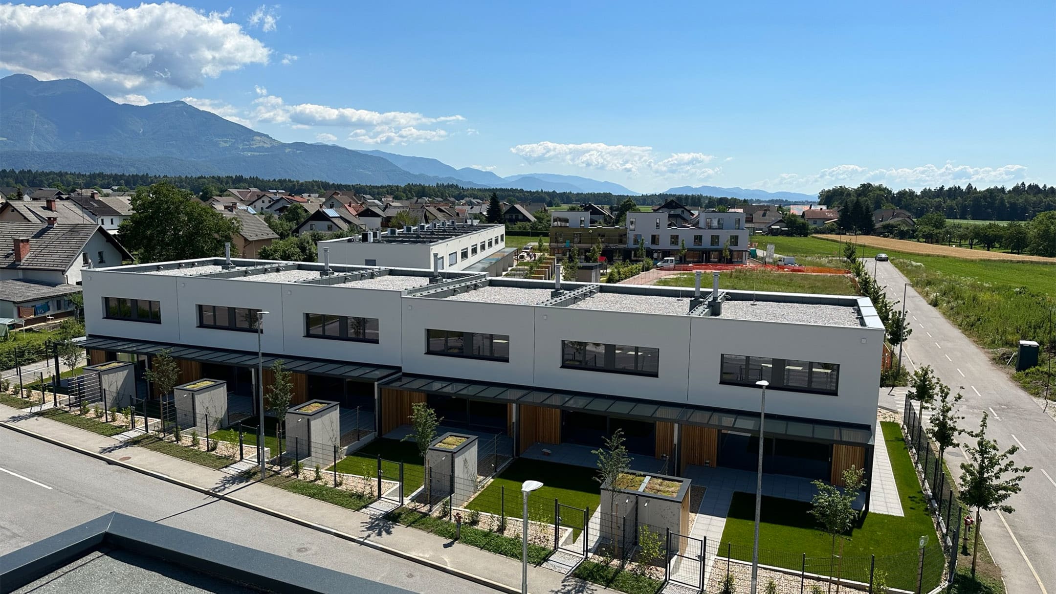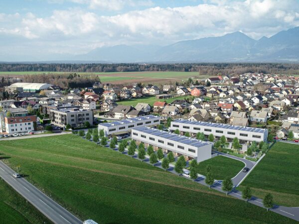 In a sunny and peaceful location in Šenčur, just minutes from Ljubljana, Kranj, Brnik Airport, and the highway connection, a thoughtfully designed residential community of 23 terraced houses is taking shape.