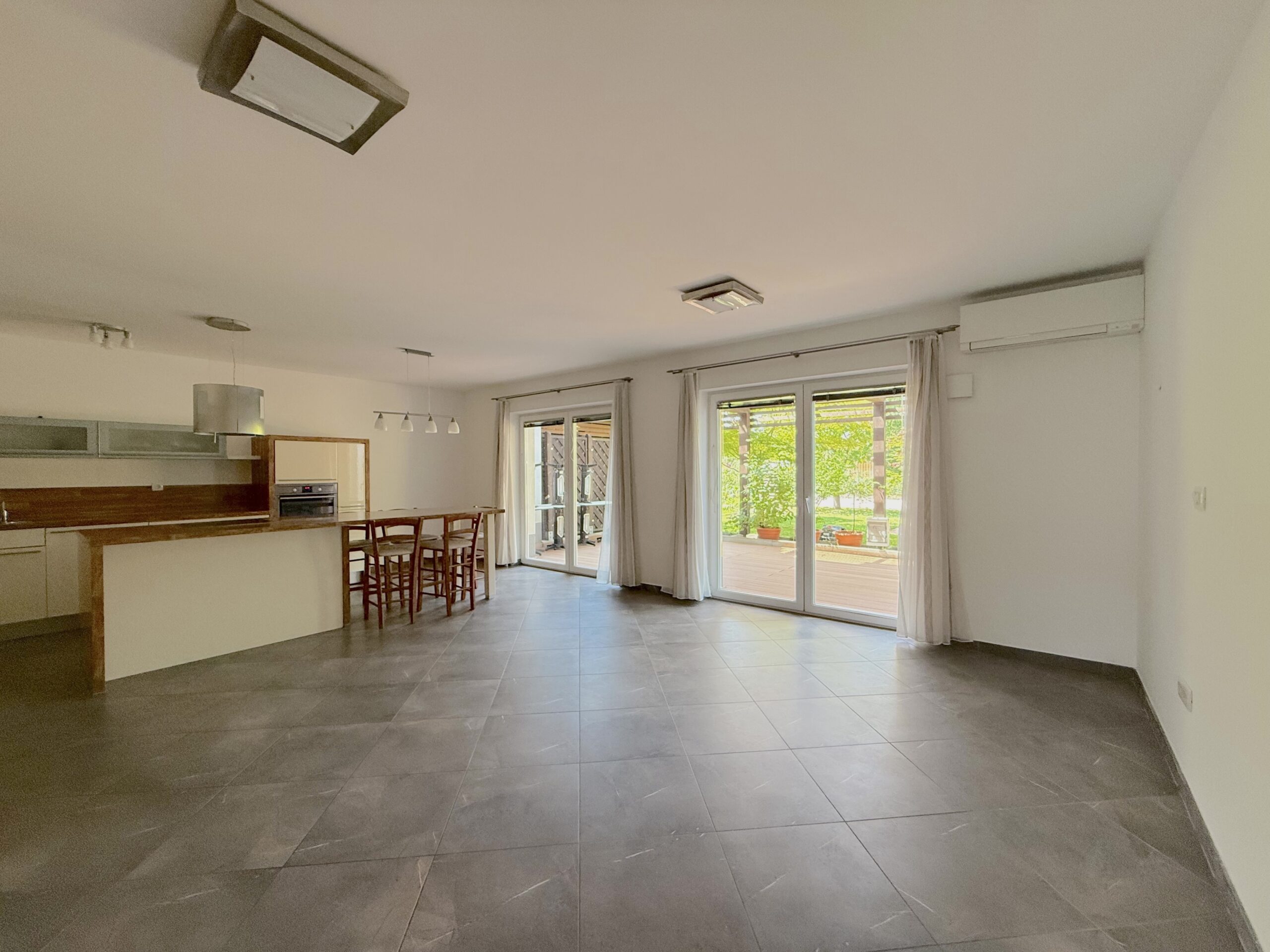 Prostoren dnevni prostor za jedilnico in dnevno sobo, ki se prek velikih steklenih površin odpirata na prostorno pokrito teraso in urejen vrt
