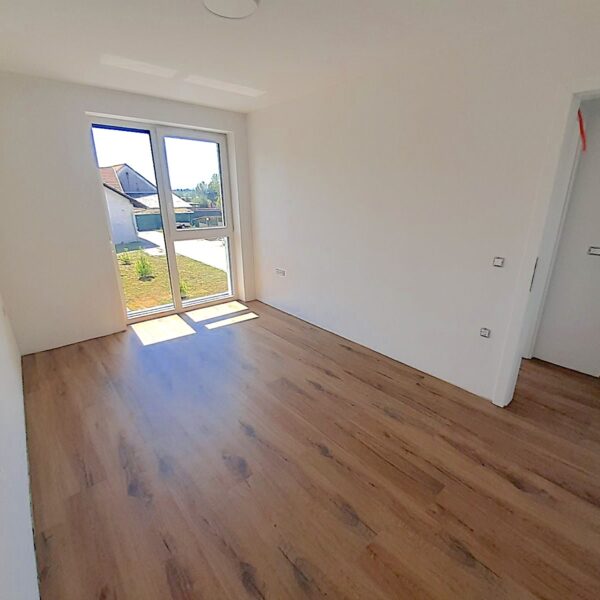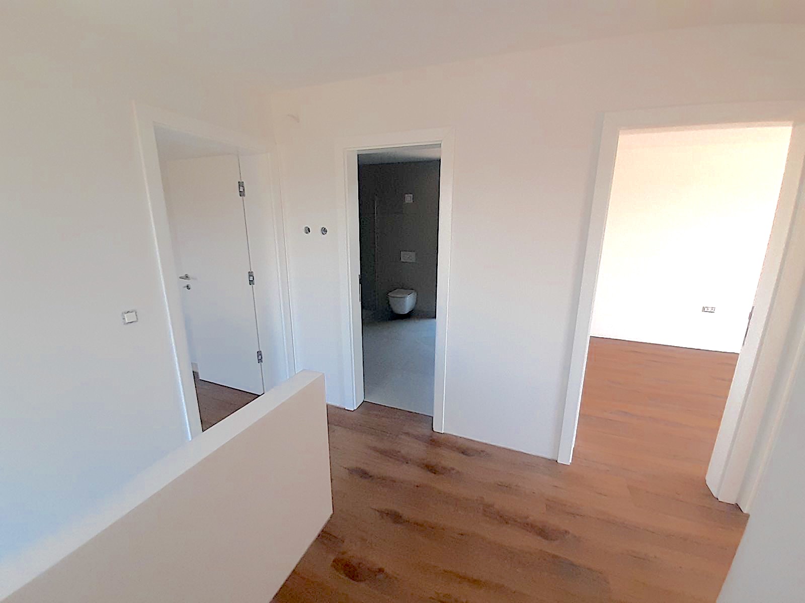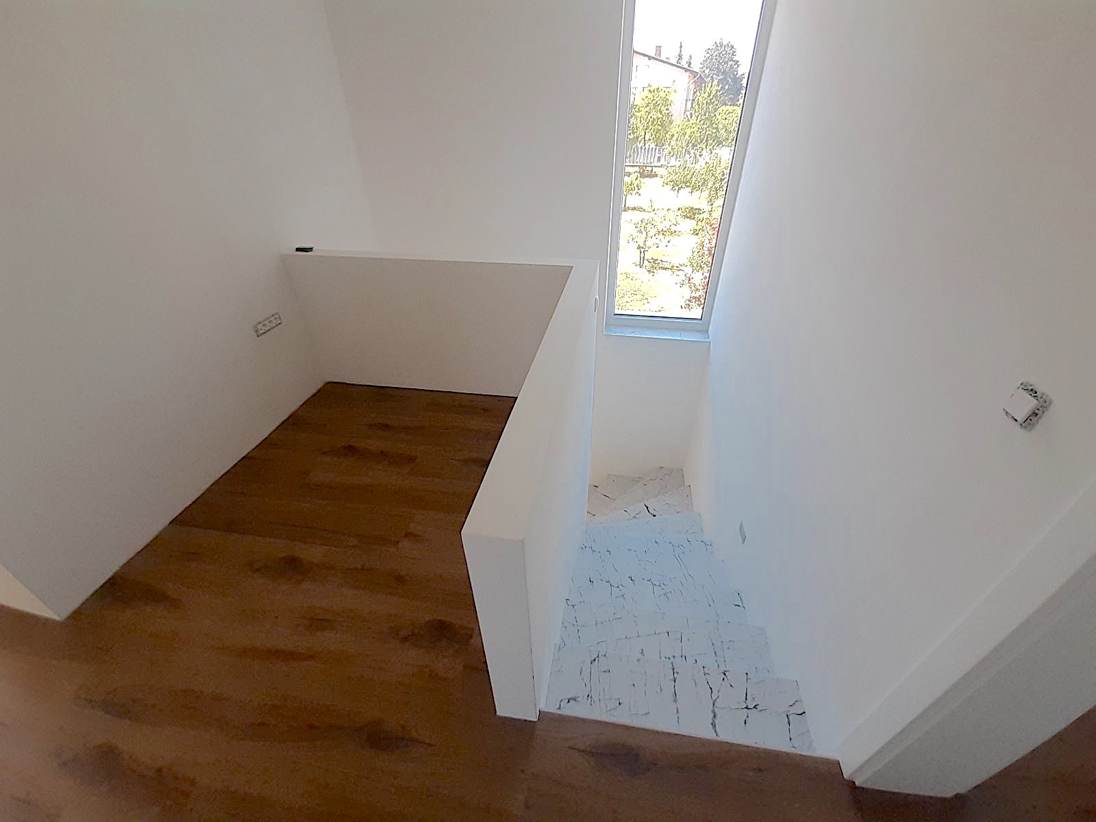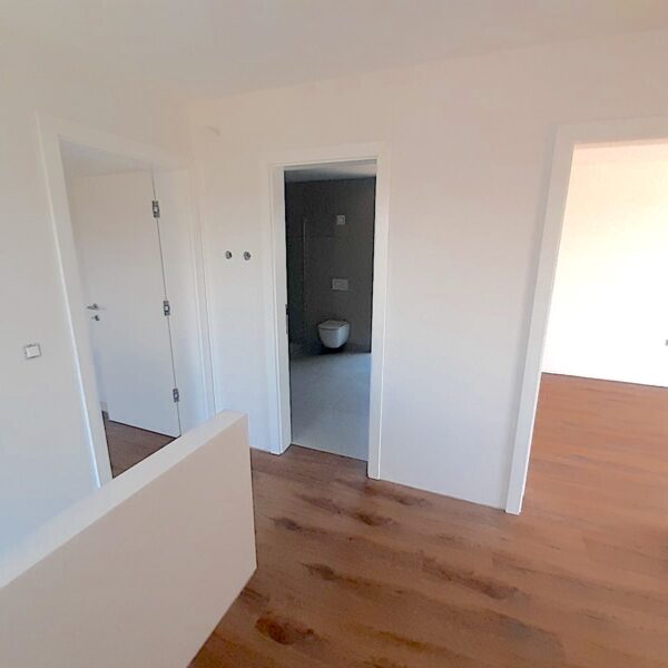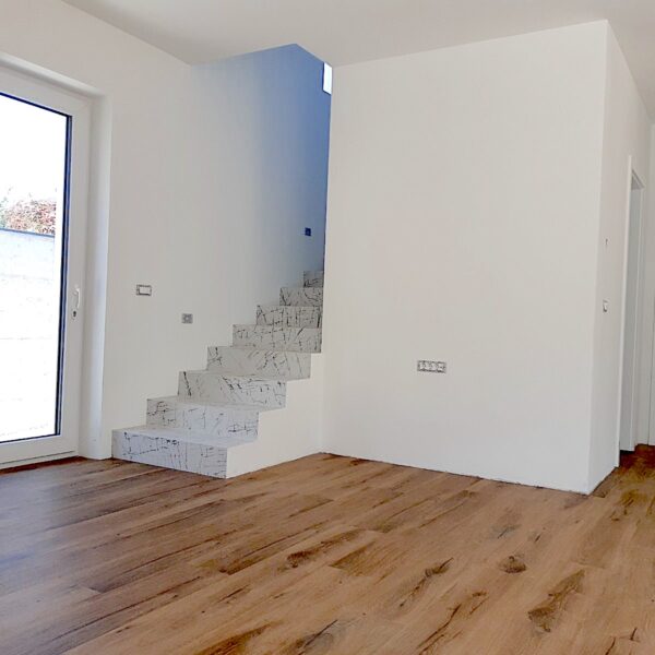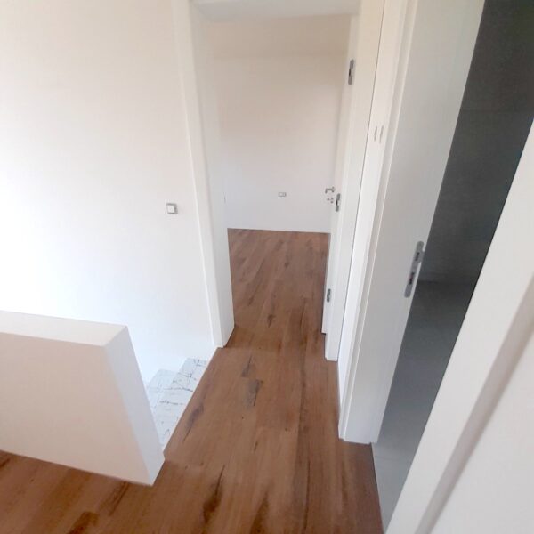 Hiša je bila zgrajena v letošnjem letu in ima 130 m2 stanovanjske površine ter dve etaži. V pritličju se nahaja hodnik, soba in opremljena kopalnica, prav tako sta pod stopniščem shramba in tehnični prostor. Bivalni prostor prvega nadstropja vsebuje opremljeno kuhinjo, jedilnico in dnevni prostor z izhodom na teraso. V prvem nadstropju se nahaja velika spalnica z garderobo, dve svetli otroški sobi in opremljena kopalnica.