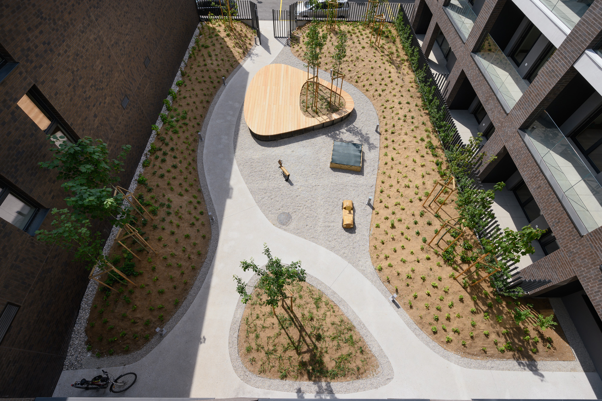 Kompleks obdaja zeleni atrij, v pritličju so umeščeni poslovni prostori, do katerih vodi pešpot s Topniške ulice, prilagojena tudi gibalno oviranim osebam. Ob objektu se nahaja kolesarnica, v kletnih prostorih pa so shrambe in tehnični prostori. Za oba objekta je zagotovljenih 123 parkirnih mest v podzemni garaži ter 13 zunanjih parkirnih mest za poslovne prostore.
