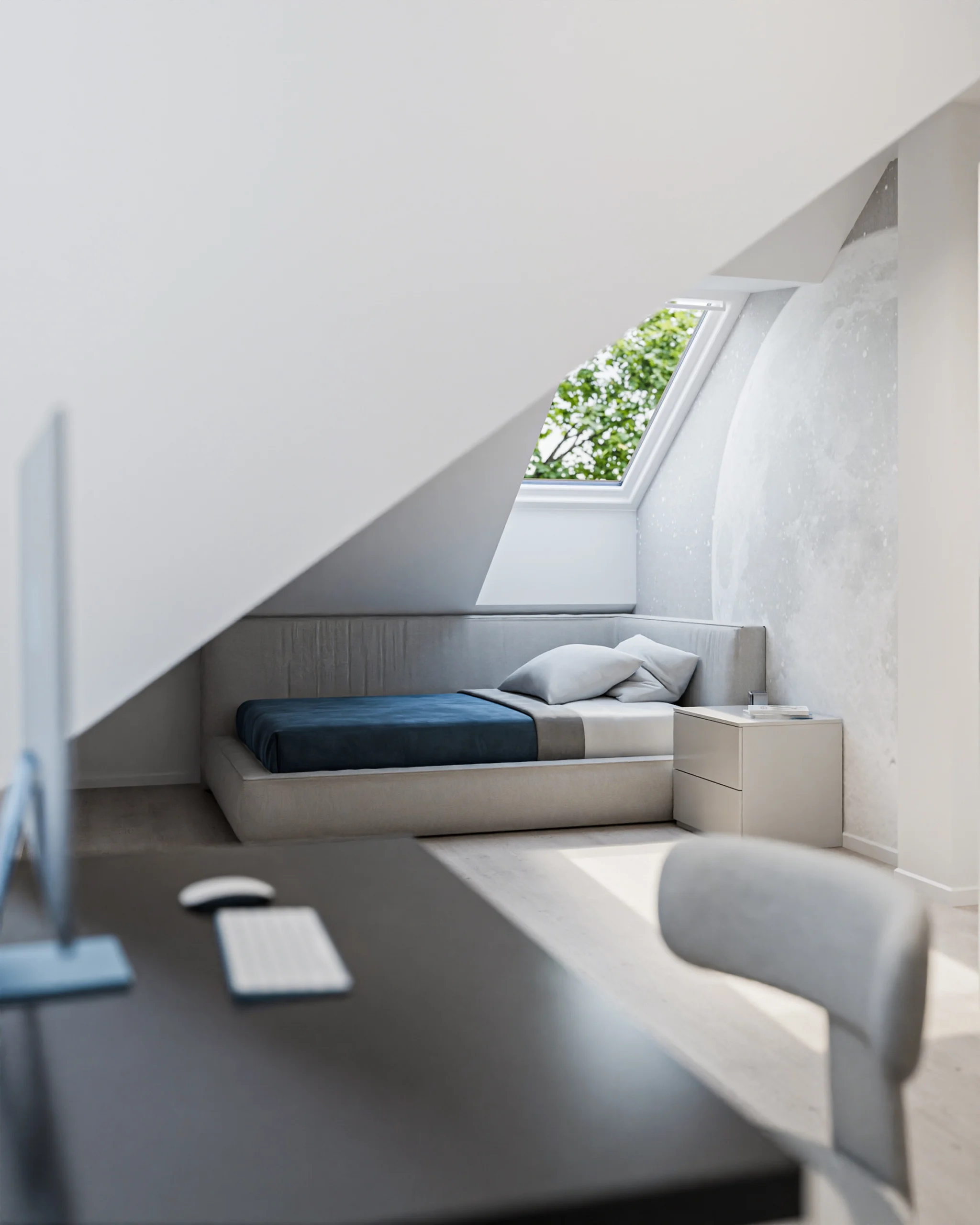 Razkošno štirisobno stanovanje S 203 površine 138,7 m2 se razprostira preko dveh etaž. Ob vhodnem predprostoru se nahaja sanitarni prostor za goste. V udoben dnevno bivalni prostor so umeščene kuhinja, jedilnica in dnevna soba, od koder je preko več steklenih površin omogočen dostop na balkon. Pokrit balkon velikosti 12,5 m2 predstavlja prijeten zunanji podaljšek dnevno-bivalnega prostora. Kuhinja ima urejene vse potrebne priključke in prostor za otok. Nad dnevno sobo se dviga dvovišinski prostor, ki komunicira z zgornjo etažo preko galerije. Vogalni spalnici pripada lastna kopalnica s tušem. Notranje stopnice vodijo v zgornjo etažo. Z osrednje galerije se vstopa v dve veliki mansardni otroški sobi, ki imata svojo kopalnico s tušem. Stanovanje ima tristransko orientacijo. Preko klasičnih oken v spodnji etaži in kvalitetnih strešnih oken v zgornji etaži se odpira proti jugo-vzhodu, jugo-zahodu in severo-zahodu.